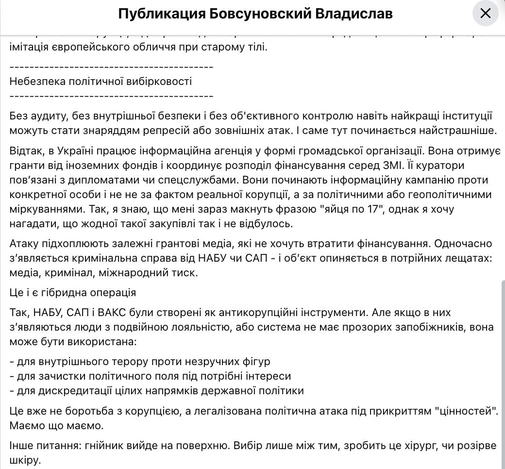 "Они запускают информационную кампанию против конкретного лица не по факту реальной коррупции, а по политическим или геополитическим причинам. Атаку подхватывают зависимые грантовые медиа, не желающие терять финансирование. Одновременно появляется уголовное дело от НАБУ или САП — и объект оказывается в тройных тисках: медиа, уголовное преследование, международное давление. Вот это и есть гибридная операция", - сказано в публикации Бовсуновского.