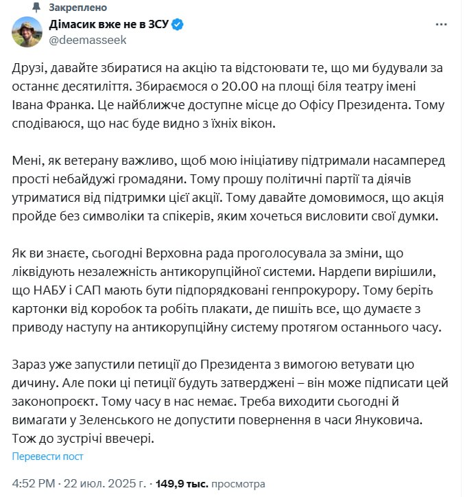 "Друзья, давайте собираться на акцию и отстаивать то, что мы строили в последнее десятилетие. Собираемся в 20:00 на площади у театра имени Ивана Франко. Это ближайшее доступное место возле Офиса президента", – написал бывший военный.
