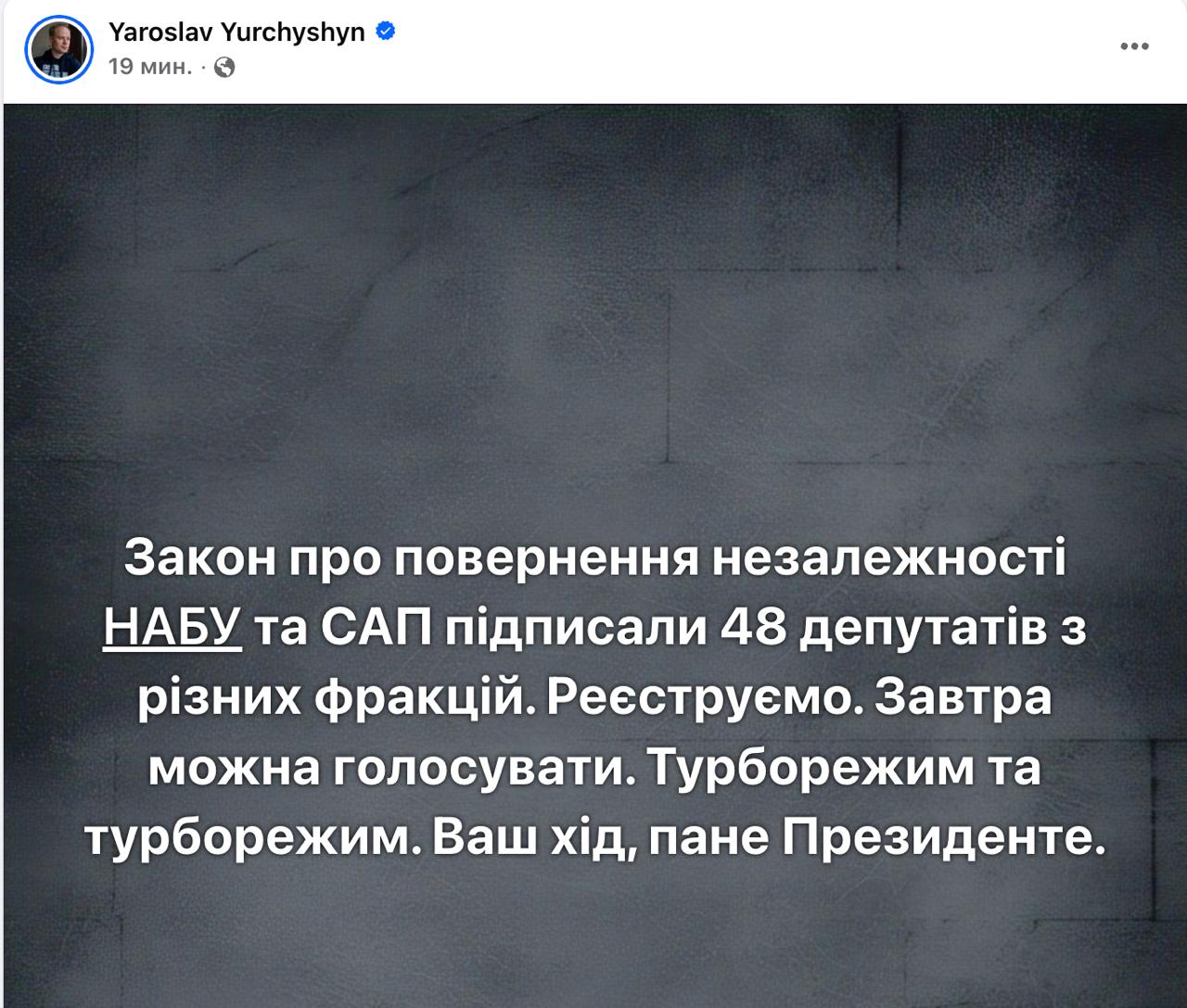 Юрчишин призывает вынести его на голосование уже завтра.