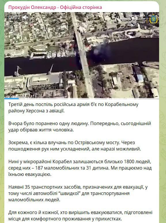 16:19 Херсонская ОВА публикует видео сегодняшних ударов российскими КАБами по мосту в Корабельном районе Херсона. Видны прилёты непосредственно по мосту. По данным ОВА, он получил сильные разрушения, но проезд по нему все ещё возможен.
