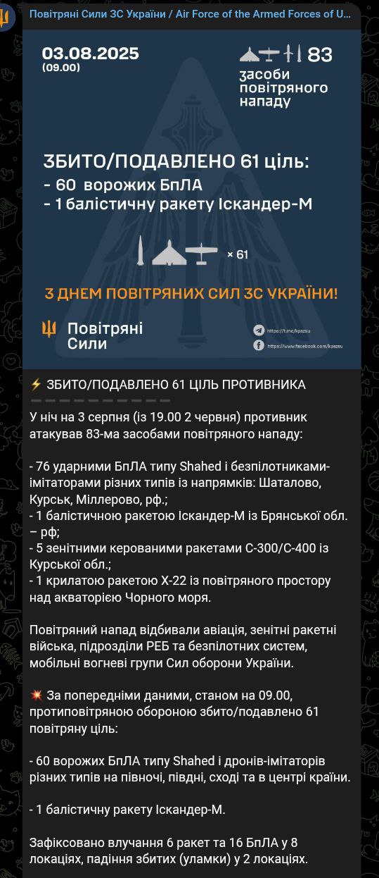 09:09 Ночью по Украине было шесть ракетных прилётов и 16 ударов беспилотниками, сообщают ВСУ.