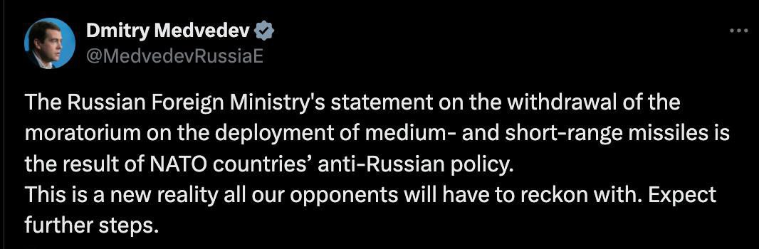 "Это новая реальность, с которой придётся считаться всем нашим оппонентам. Ждите дальнейших шагов", - написал Медведев.