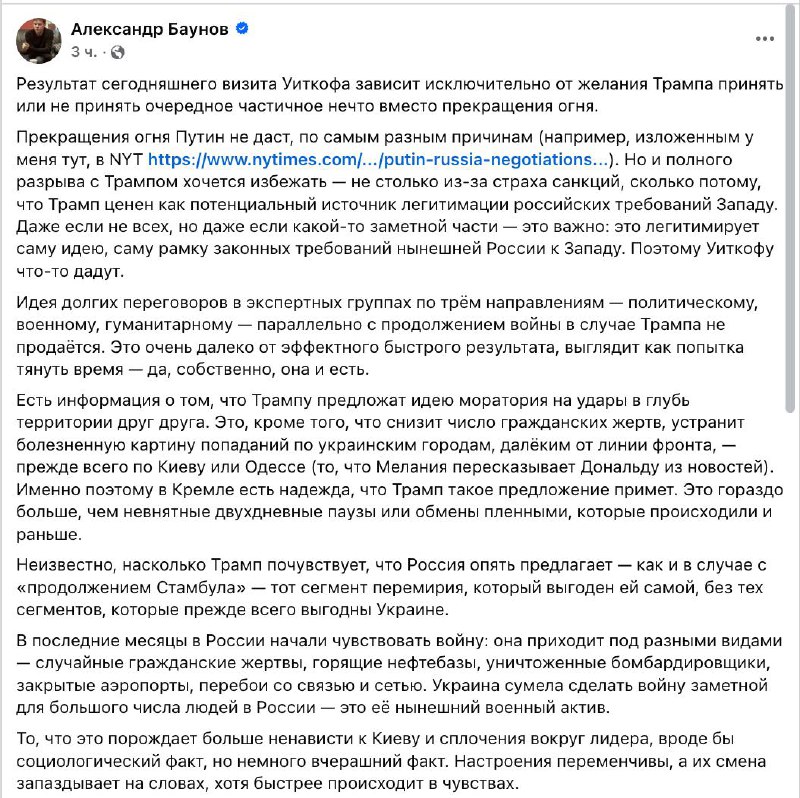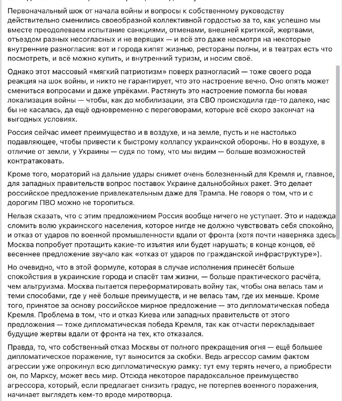 "Россия сейчас имеет преимущество и в воздухе, и на земле, пусть и не настолько подавляющее, чтобы привести к быстрому коллапсу украинской обороны. Но в воздухе, в отличие от земли, у Украины — судя по тому, что мы видим — больше возможностей контратаковать. Кроме того, мораторий на дальние удары снимет очень болезненный для Кремля и, главное, для западных правительств вопрос поставок Украине дальнобойных ракет. Это делает российское предложение привлекательным даже для Трампа. Не говоря о том, что и с дорогим ПВО можно не торопиться. Также это устранит болезненную картину попаданий по украинским городам, далёким от линии фронта, — прежде всего по Киеву или Одессе (то, что Мелания пересказывает Дональду из новостей). Именно поэтому в Кремле есть надежда, что Трамп такое предложение примет. Это гораздо больше, чем невнятные двухдневные паузы или обмены пленными, которые происходили и раньше", - пишет Баунов.