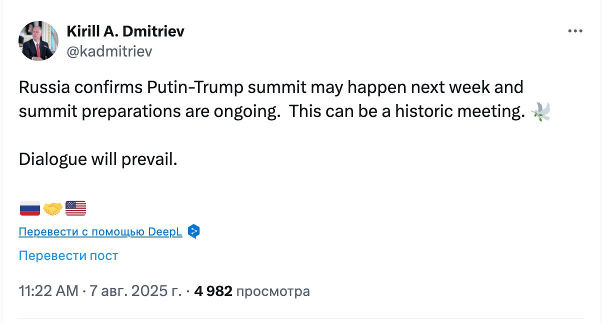 При этом спецпредставитель Кремля Кирилл Дмитриев заявил, что запланированная встреча Путина и Трампа может стать "исторической".