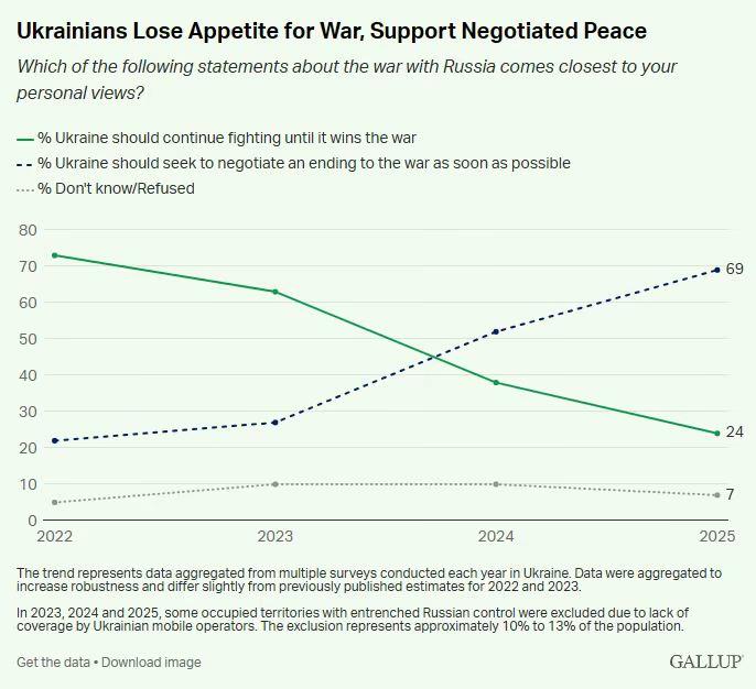 "Спустя более трёх лет после начала войны поддержка украинцами идеи продолжения боевых действий до победы достигла нового минимума. Согласно последнему опросу Gallup, проведённому в Украине в начале июля, 69% опрошенных заявили, что выступают за скорейшее прекращение войны путём переговоров, в то время как 24% высказались за продолжение боевых действий до победы", - сказано в пресс-релизе.