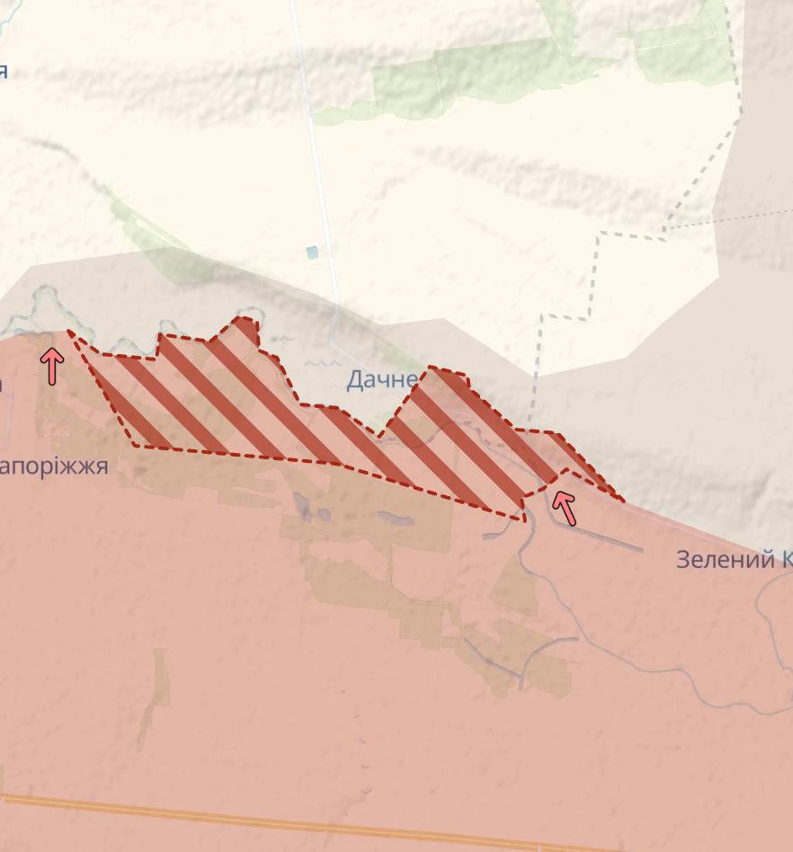 09:40 Армия РФ перебралась через реку Волчья и закрепилась на территории Днепропетровской области в районе Дачного, свидетельствует карта Deep State.
