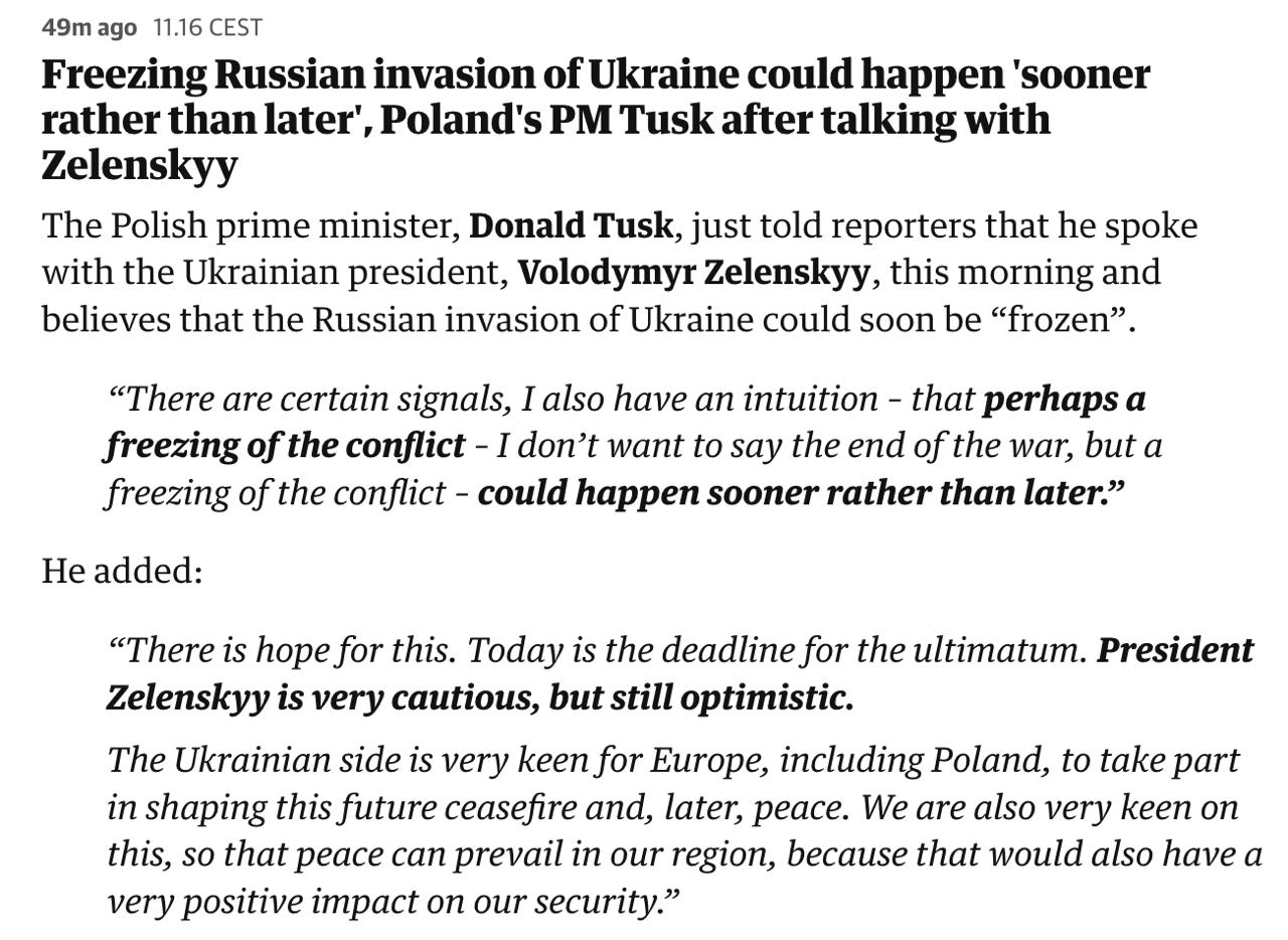 13:13 Заморозка войны в Украине может произойти "скорее раньше, чем позже". Об этом заявил премьер Польши Туск после беседы с Зеленским, передает The Guardian.