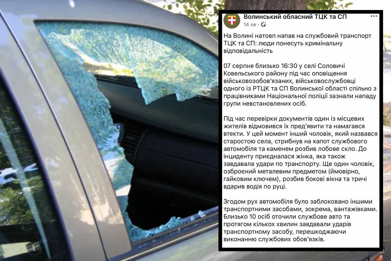 13:59 Волынский ТЦК сообщает о нападении гражданских лиц на его автомобиль в селе Соловичи. В нападении участвовал и староста села.