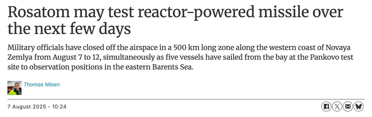 15:01 В ближайшие дни Россия может испытать межконтинентальную ракету "Буревестник" с ядерной энергетической установкой на Новой Земле, сообщает The Barents Observer.