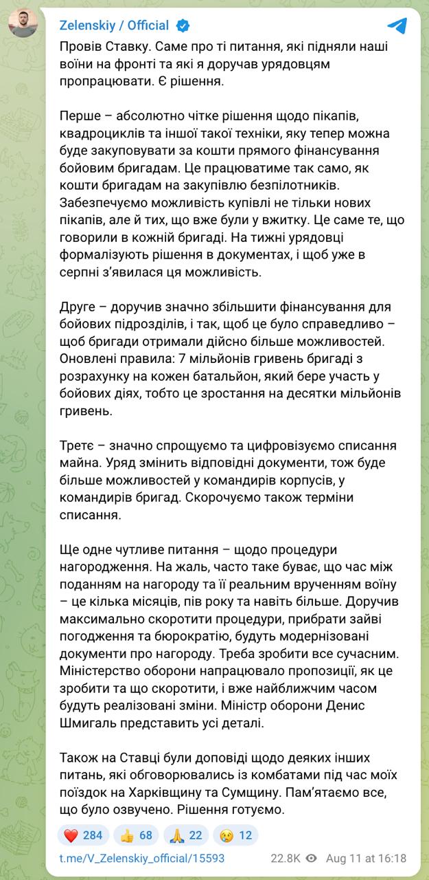 16:30 Боевые бригады получат больше финансирования, обещает Зеленский по итогам Ставки.