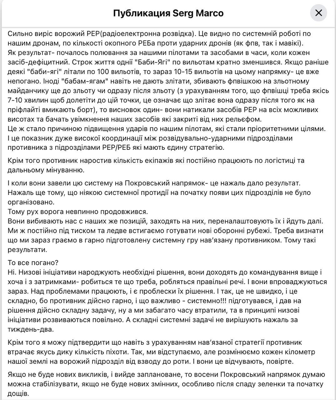 "Кроме того, противник увеличил количество экипажей, которые постоянно работают по логистике и дальнему минированию. И когда они развернули эту систему на Покровском направлении, к сожалению, это дало результат", - пишет Марко.
