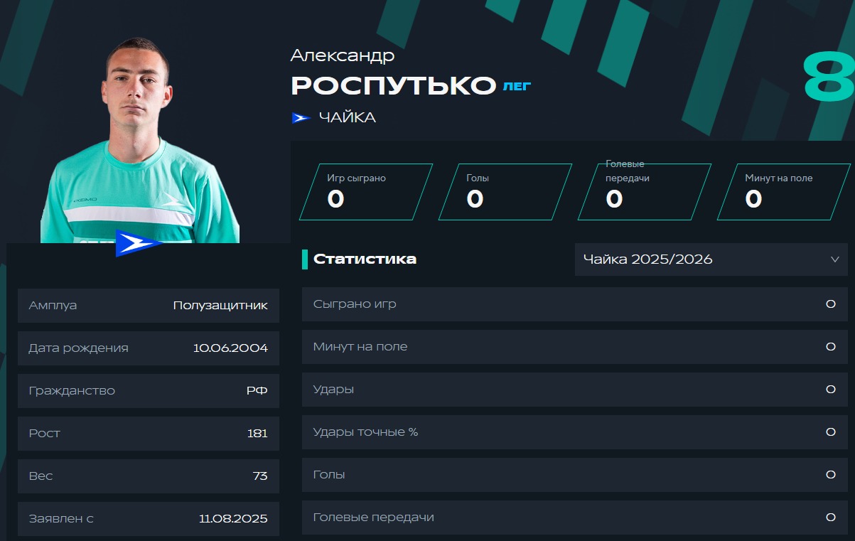 В профиле полузащитника указано гражданство России и членство в команде из села Песчанокопского Ростовской области. При этом "Чайка" официально не объявляла о подписании контракта с Роспутько и на её официальном сайте среди игроков он не значится.
