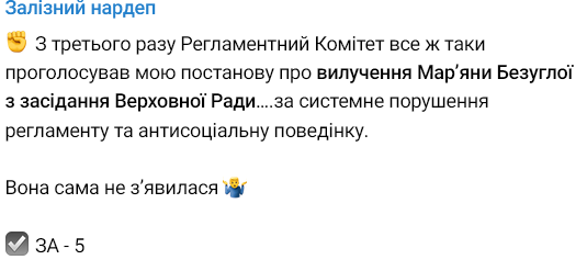 По словам нардепа, отстранить Безуглую предлагают "за систематическое нарушение регламента и антисоциальное поведение".