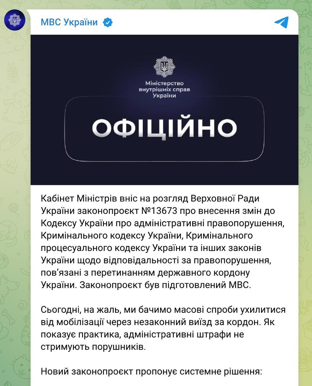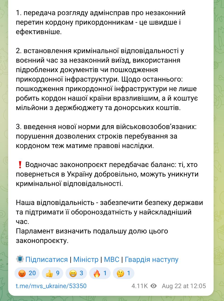 Министерство внутренних дел сообщает, что это оно разработало законопроект об уголовной ответственности за незаконный выезд за границу, внесенный в Раду премьером Свириденко.