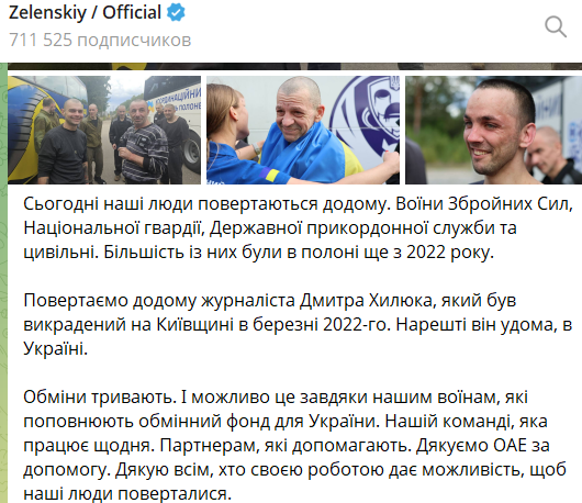 Президент Украины поблагодарил ОАЭ за посреднические дипломатические усилия.