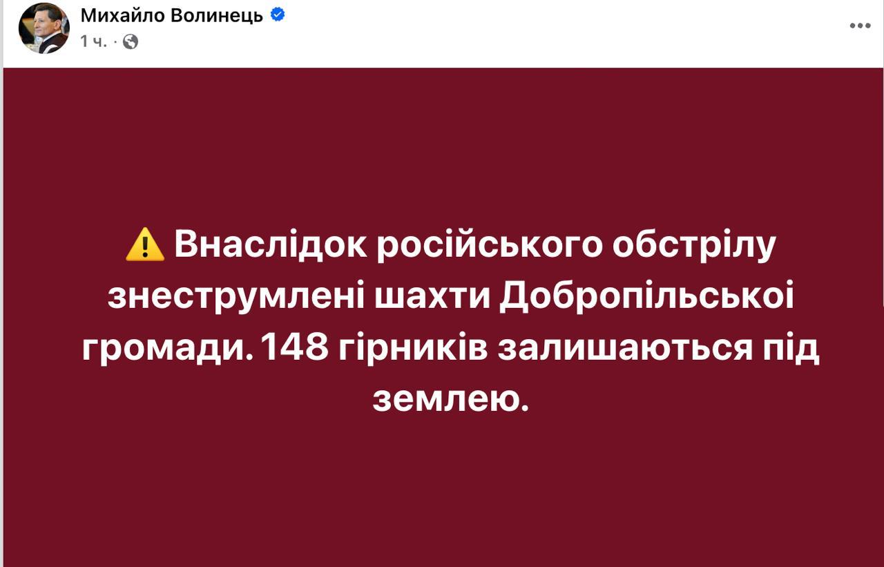 13.26 В прифронтовом Добропольском районе Донецкой области 148 шахтеров застряли под землей из-за отключения света после обстрела.