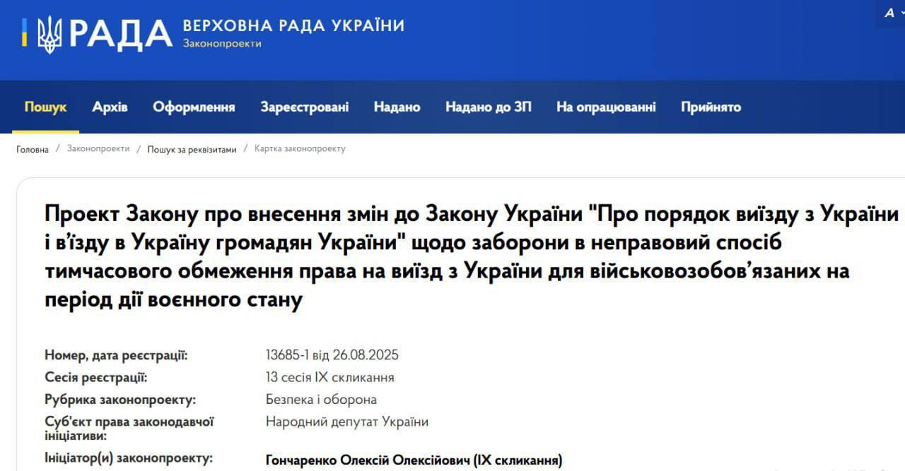 16.55 Нардеп Гончаренко подал законопроект, предлагающий снять ограничения на выезд для всех мужчин призывного возраста - 18-60 лет.