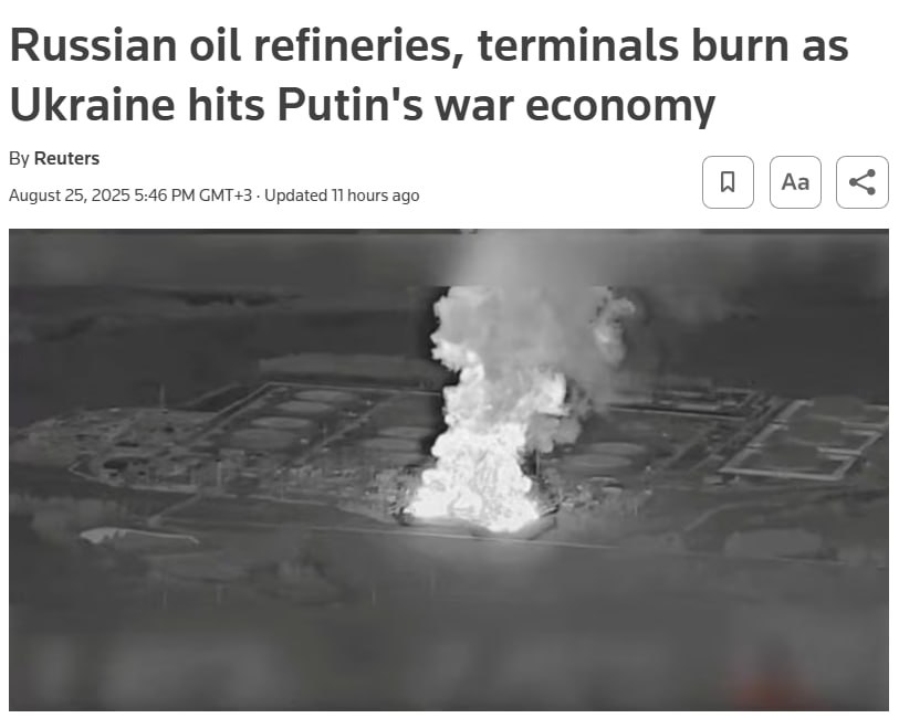 Кроме того, Reuters сообщает, что украинские дроны в этом месяце атаковали 10 российских НПЗ, на долю которых приходится не менее 17% всех российской мощности переработки.