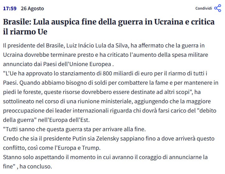 Об этом заявил президент Бразилии Луис Инасиу Лула да Силва, чьи слова приводит RAI News.