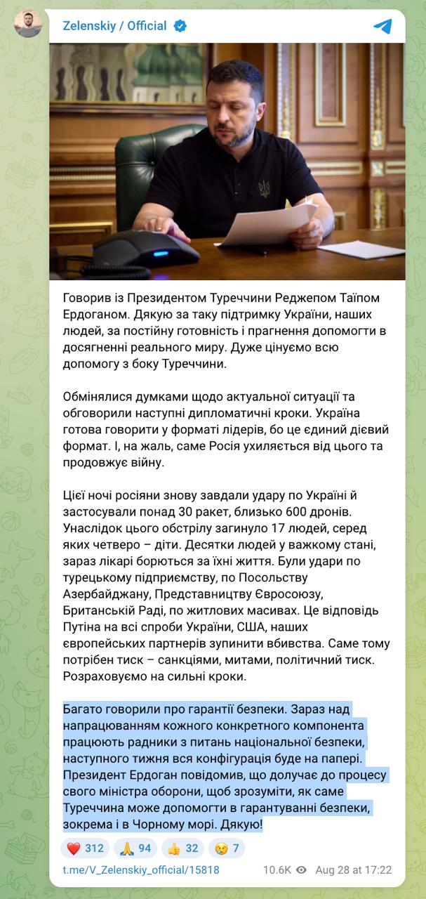 "Многие говорили о гарантиях безопасности. Сейчас над наработкой каждого конкретного компонента работают советники по национальной безопасности, на следующей неделе вся конфигурация будет на бумаге", - пишет Зеленский после переговоров с президентом Турции Реджепом Тайипом Эрдоганом.