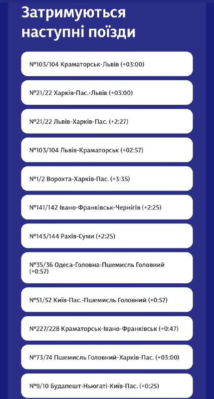 "В результате ночного вражеского обстрела и повреждения железнодорожной инфраструктуры в Киевской области ряд поездов задерживается и прибудет на станцию ​​Киев с опозданием от 2 часов", - сообщает "Укрзализныця".