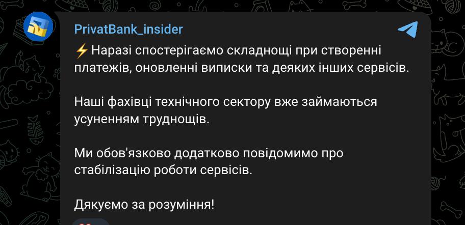 "Сейчас наблюдаются сложности при создании платежей, обновлении выписки и некоторых других сервисов. Наши специалисты технического сектора уже занимаются устранением неполадок", — отметили в "Приватбанке".