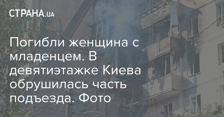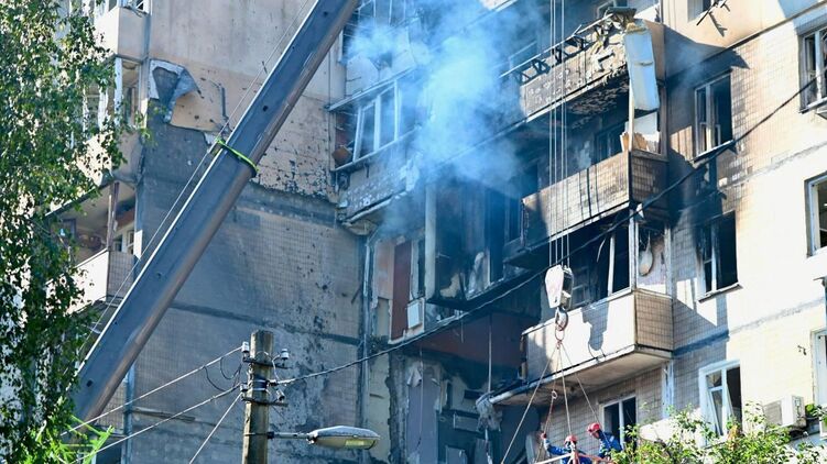Во время ночного обстрела Киева пострадал девятиэтажный дом в Святошинском районе. Часть подъезда серьезно обрушилась.