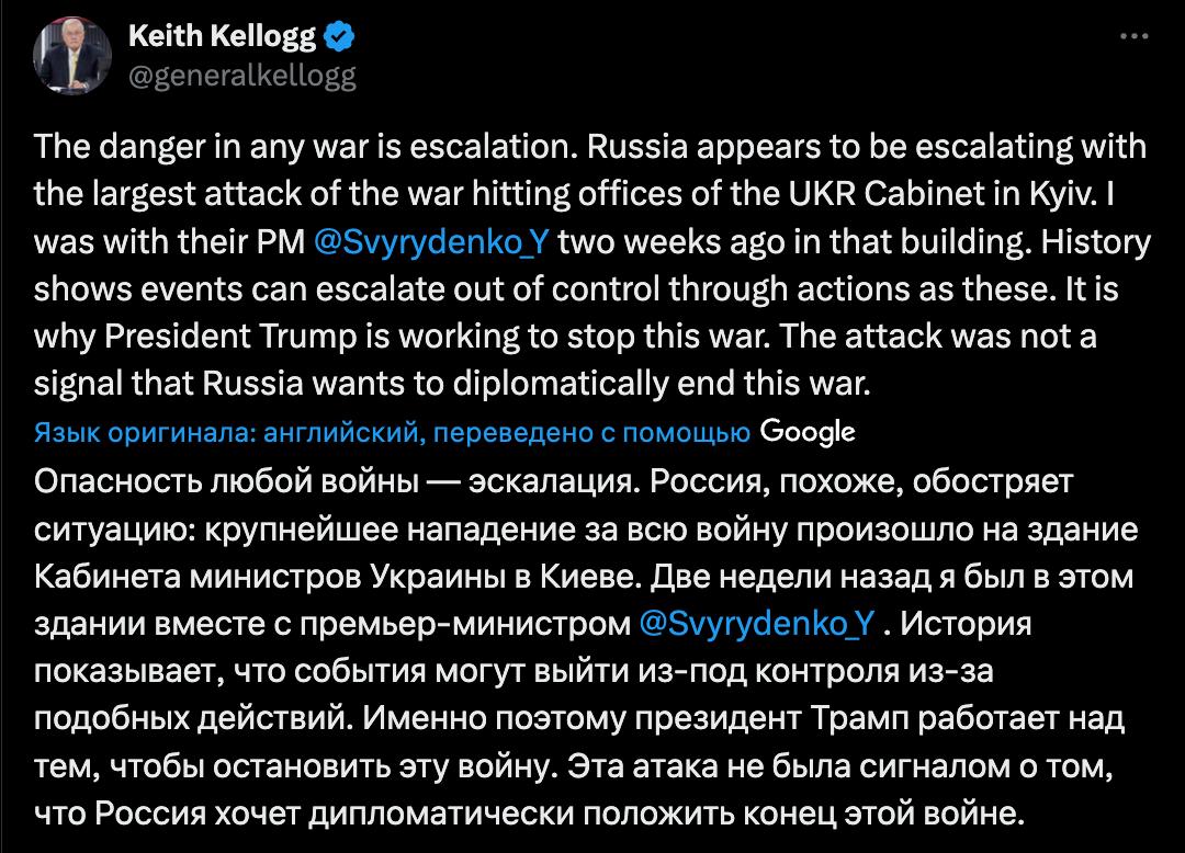 "Опасность любой войны — эскалация. Россия, похоже, обостряет ситуацию: крупнейшее нападение за всю войну произошло на здание Кабинета министров Украины в Киеве. Две недели назад я был в этом здании вместе с премьер-министром Свириденко", - написал Келлог.