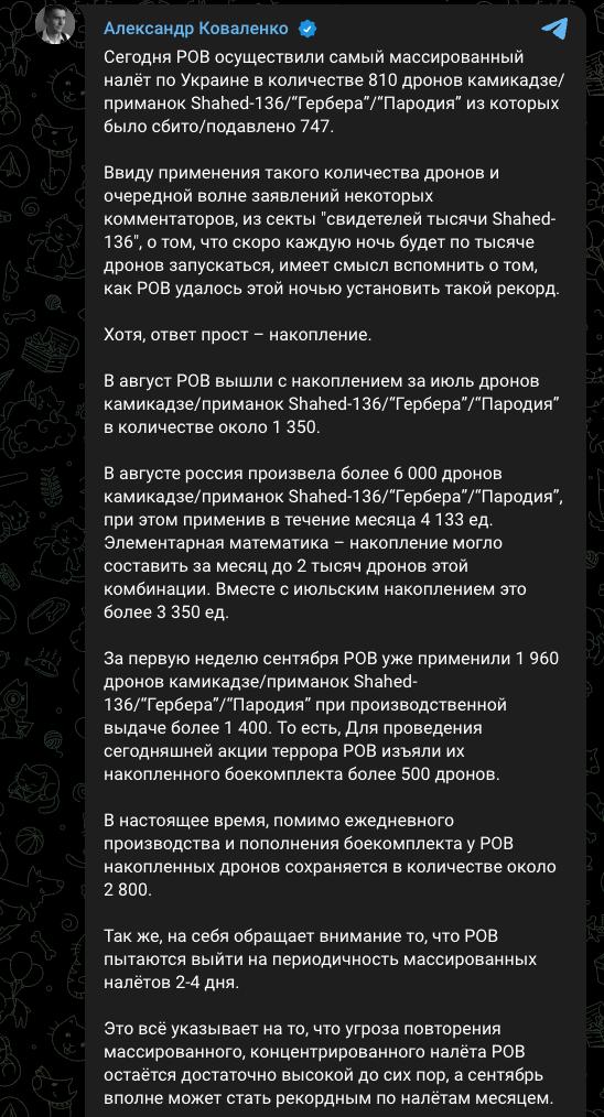 "Это всё указывает на то, что угроза повторения массированного, концентрированного налёта российских войск остаётся довольно высокой до сих пор, а сентябрь вполне может стать рекордным по налётам месяцем", - написал Коваленко.