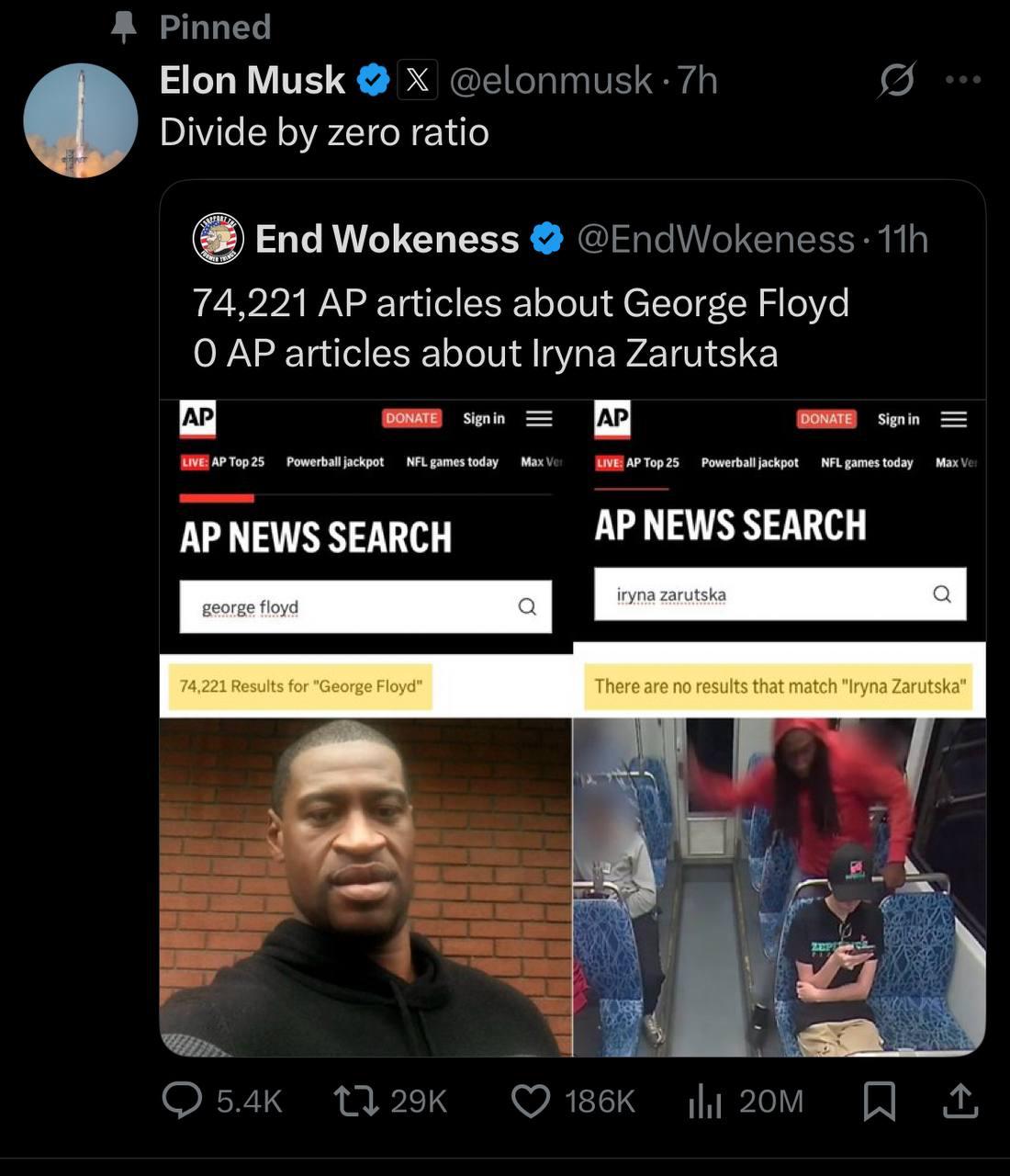Маск репостнул и закрепил сообщение о том, что издание Associated Press, ориентированное на демократов, не написало об убийстве украинки, зато активно освещало убийство в 2020 году темнокожего мужчины Джорджа Флойда белым полицейским.