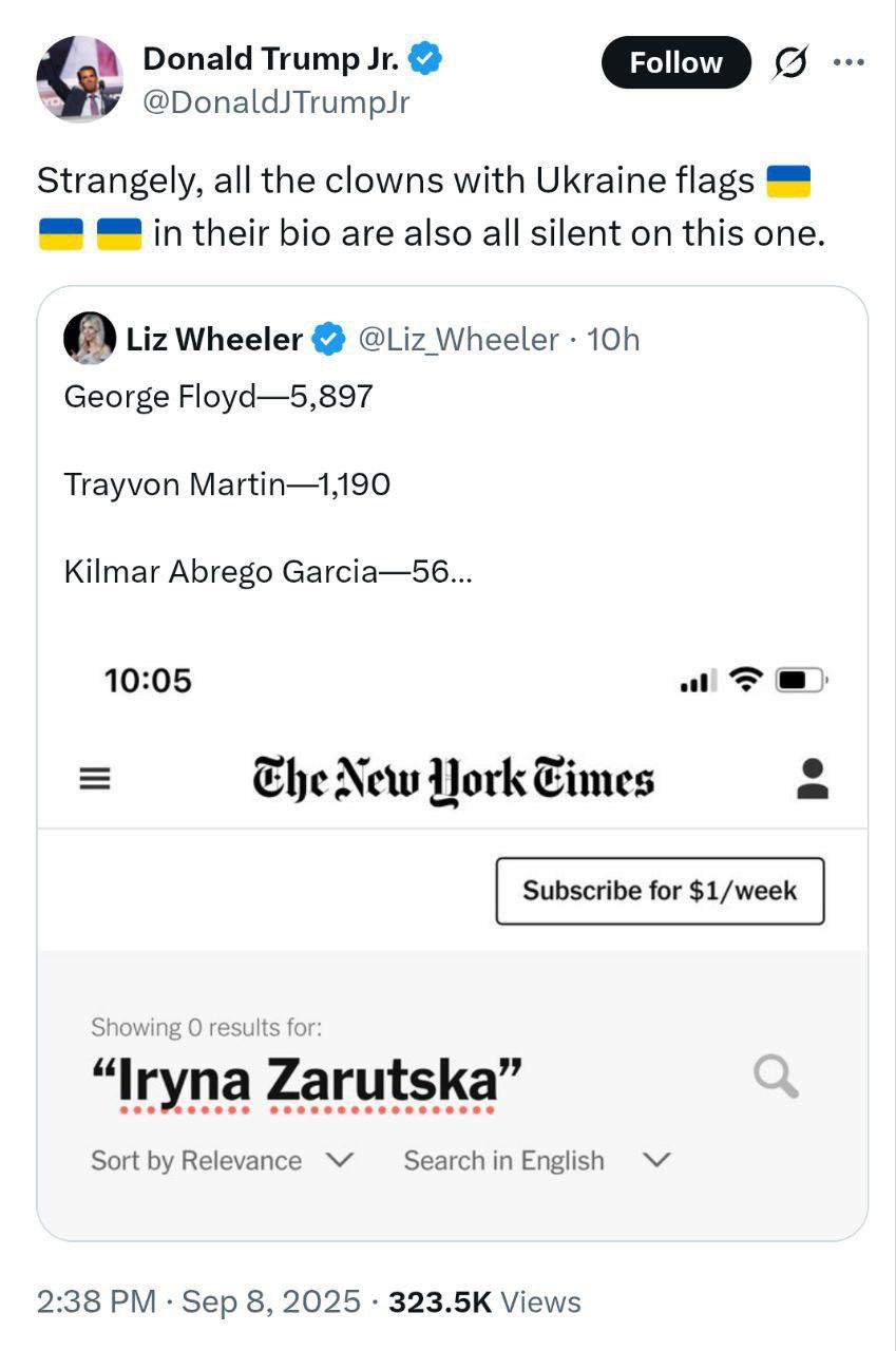 Cын Трампа обвинил в замалчивании истории с убийством украинки темнокожим в США не только СМИ, ориентированные на Демпартию, но и проукраинских пользователей.