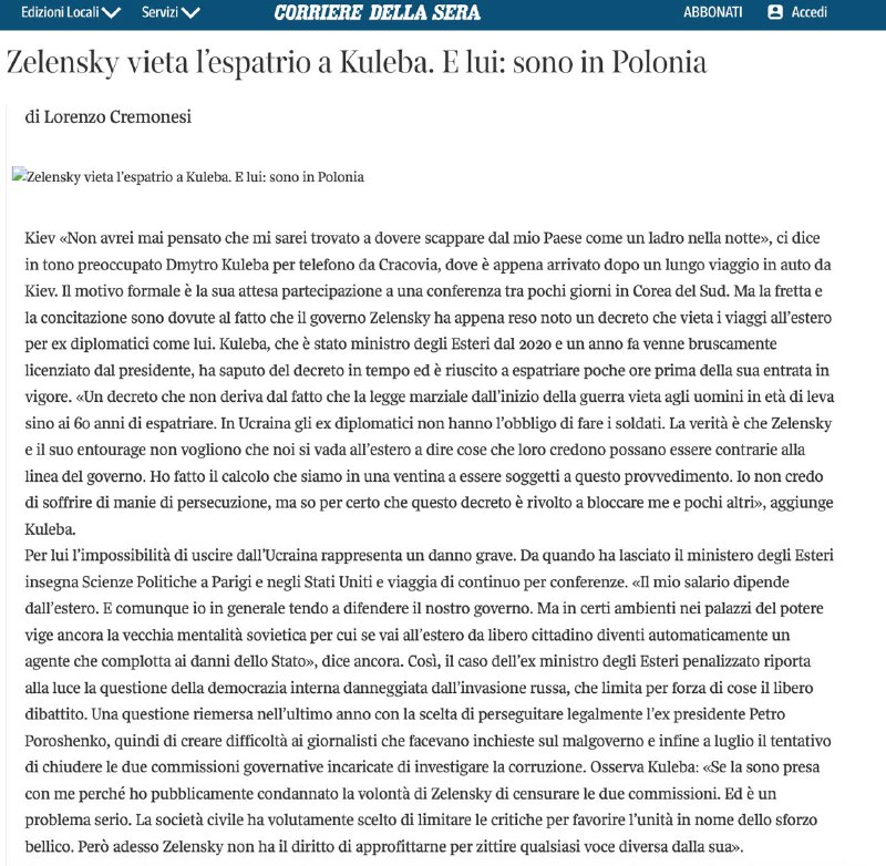 Издание пишет, что Кулеба "узнал об указе вовремя и сумел выехать всего за несколько часов до его вступления в силу".