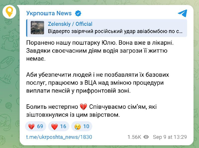 По сообщению украинских властей, толпа пенсионеров в прифронтовом регионе собралась на открытой местности около автомобиля почты, когда по ним прилетел КАБ. К моменту выхода новости погибших уже 23 человека, хотя сразу после атаки сообщалось о 21 жертве. Среди 18 раненых почтальон по имени Юлия. Она выжила "благодаря своевременным действиям водителя".