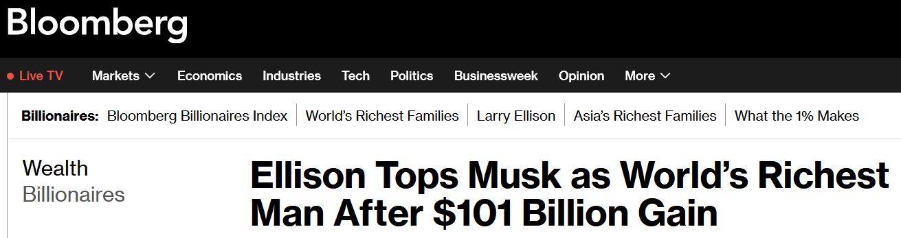 В результате капитал Эллисона достиг 393 миллиардов долларов, согласно данным индекса миллиардеров Bloomberg. Это стало крупнейшим однодневным ростом состояния, когда-либо зафиксированным в истории индекса.