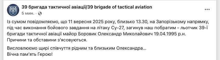 16.22 Сегодня в Запорожской области разбился Су-27 ВСУ, погиб 30-летний пилот, майор Боровик Александр Николаевич.