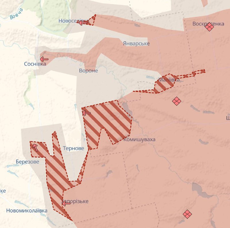 В частности, россияне зашли в Новоселовку, Березовое, почти захватили Малиевку и окружили Терновое.