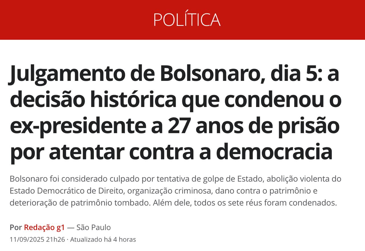 Бывшего президента Бразилии Жаира Болсонару коллегия из пяти судей Верховного суда страны приговорила к 27 годам тюремного заключения по делу о попытке государственного переворота.
