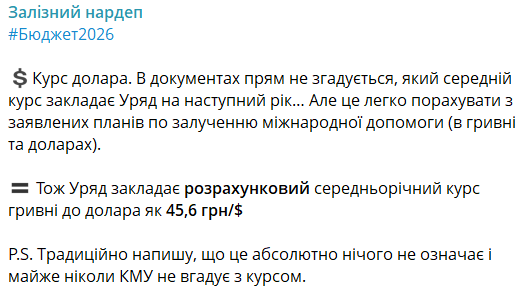 "В документах прямо не упоминается, какой средний курс закладывает правительство на следующий год... Но это легко сосчитать из заявленных планов по привлечению международной помощи (в гривне и долларах). Правительство закладывает среднегодовой курс гривни к доллару как 45,6 грн/$", – написал Железняк.