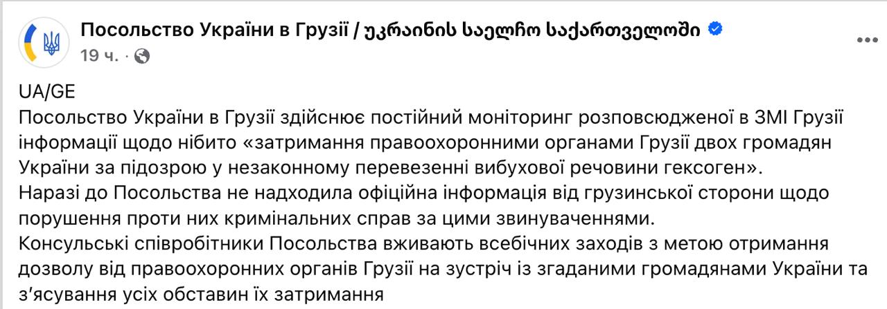 "Посольство Украины в Грузии постоянно отслеживает распространяемую в грузинских СМИ информацию о якобы задержании грузинскими правоохранительными органами двух граждан Украины по подозрению в незаконной перевозке гексогенного взрывчатого вещества.