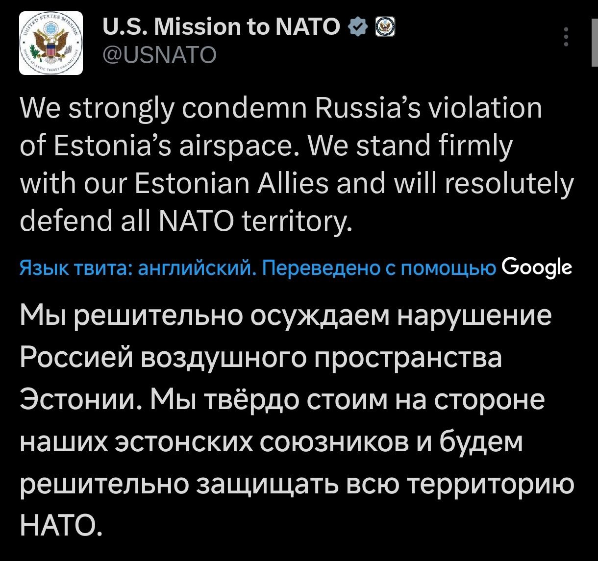 "Мы решительно осуждаем нарушение Россией воздушного пространства Эстонии. Мы твердо стоим на стороне наших эстонских союзников и будем решительно защищать всю территорию НАТО", - говорится в сообщении миссии.
