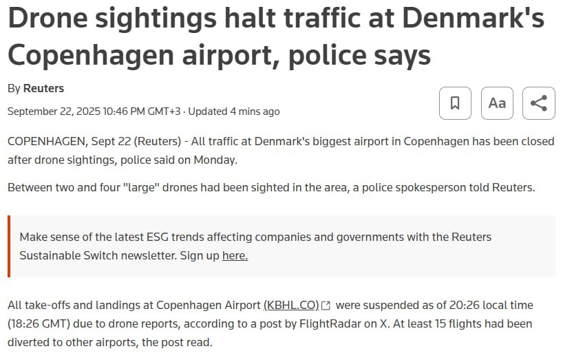 "Аэропорт Копенгагена закрыт из-за беспилотников... От двух до четырех „крупных“ беспилотников замечено в районе вокруг аэропорта Копенгагена", — цитируетагентство сообщение полиции.