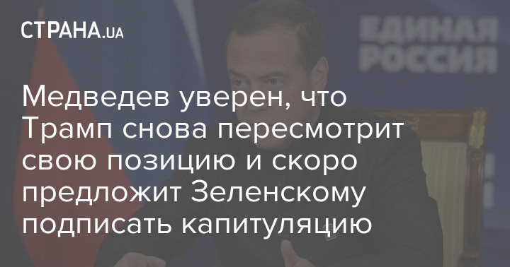 Заместитель председателя Совета Безопасности Российской Федерации Дмитрий Медведев выразил уверенность в том, что президент США Дональд Трамп опять изменит свои взгляды и вскоре предложит Владимиру Зеленскому подписать капитуляцию.