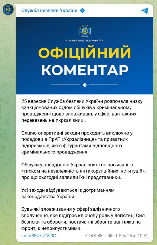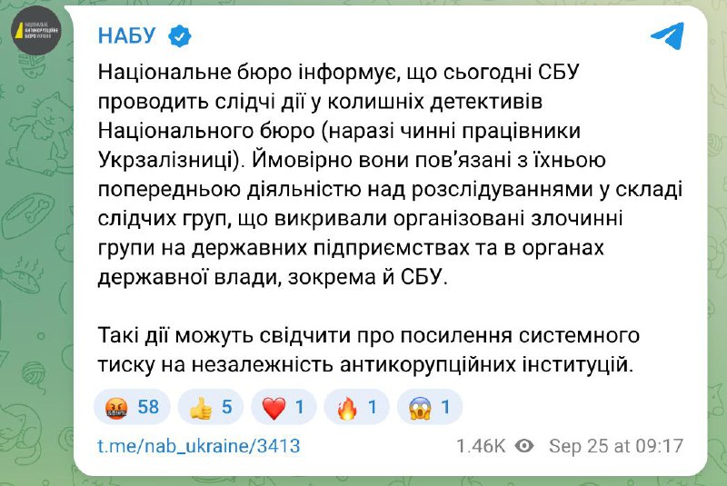 "Национальное бюро информирует, что сегодня СБУ проводит следственные действия у бывших детективов Национального бюро (в настоящее время действующие работники "Укрзализныци"). Вероятно, они связаны с их предыдущей деятельностью над расследованиями в составе следственных групп, разоблачающих организованные преступные группы на государственных предприятиях и в органах государственной власти, в том числе и СБУ. Такие действия могут свидетельствовать об усилении системного давления на независимость антикоррупционных институтов", - считают в НАБУ.