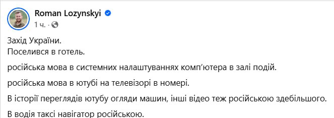 "Запад Украины. Поселился в отеле. Русский язык в системных настройках компьютера в зале событий. Русский язык в YouTube на телевизоре в номере. В истории просмотров YouTube обзоры машин, другие видео тоже по-русски в основном. У водителя такси навигатор по-русски", – написал нардеп.
