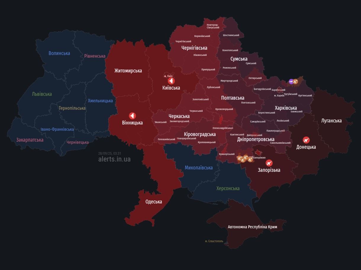 Также фиксируются пролеты в Винницкой области — один дрон перелетел из Одесской области. На севере зафиксированы по одному "шахеду" севернее Конотопа и Шостки, оба движутся на запад.