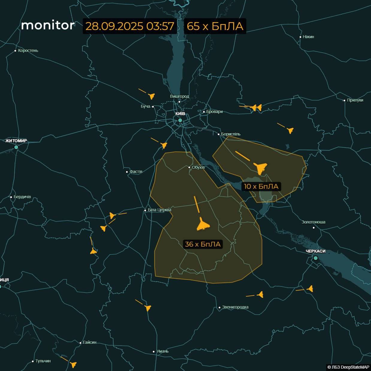 Наибольшая группа идет в сторону Белоцерковского района: 18 дронов замечены над Гайсином, еще 15 восточнее Умани, 12 в районе Смелы и 16 в районе Золотоноши. Кроме того, 8 беспилотников держат курс на Обухов.