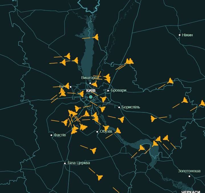 7:50 Карта "Шахедов" над Киевом и областью прямо сейчас.