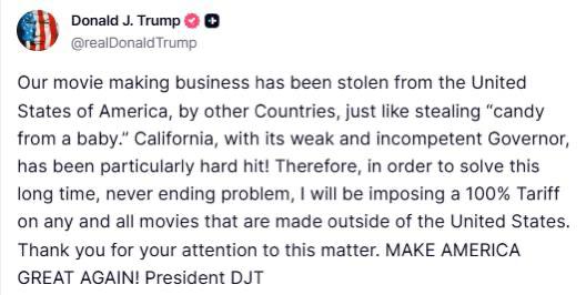 "Наш бизнес по производству фильмов был украден из США другими странами, словно конфета у ребенка. Калифорния с её слабым и некомпетентным губернатором особенно пострадала! Поэтому, чтобы решить эту давнюю и бесконечную проблему, я введу 100%-ную пошлину на любые фильмы, произведенные за пределами Соединенных Штатов", - сообщил глава Белого дома.