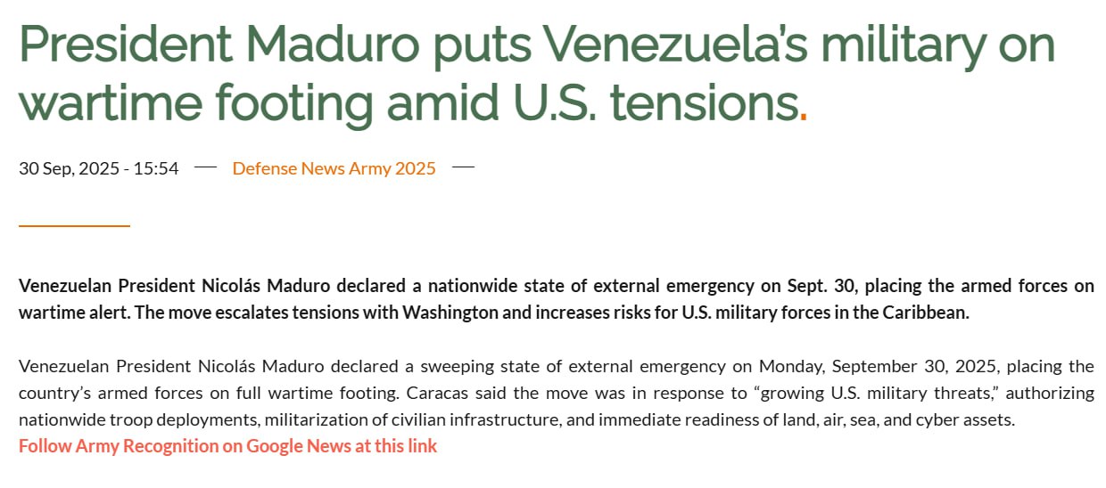 Каракас заявил, что этот шаг был предпринят в ответ на "растущие военные угрозы со стороны США", санкционировав развёртывание войск по всей стране, милитаризацию гражданской инфраструктуры и немедленную готовность наземных, воздушных, морских и киберсредств.