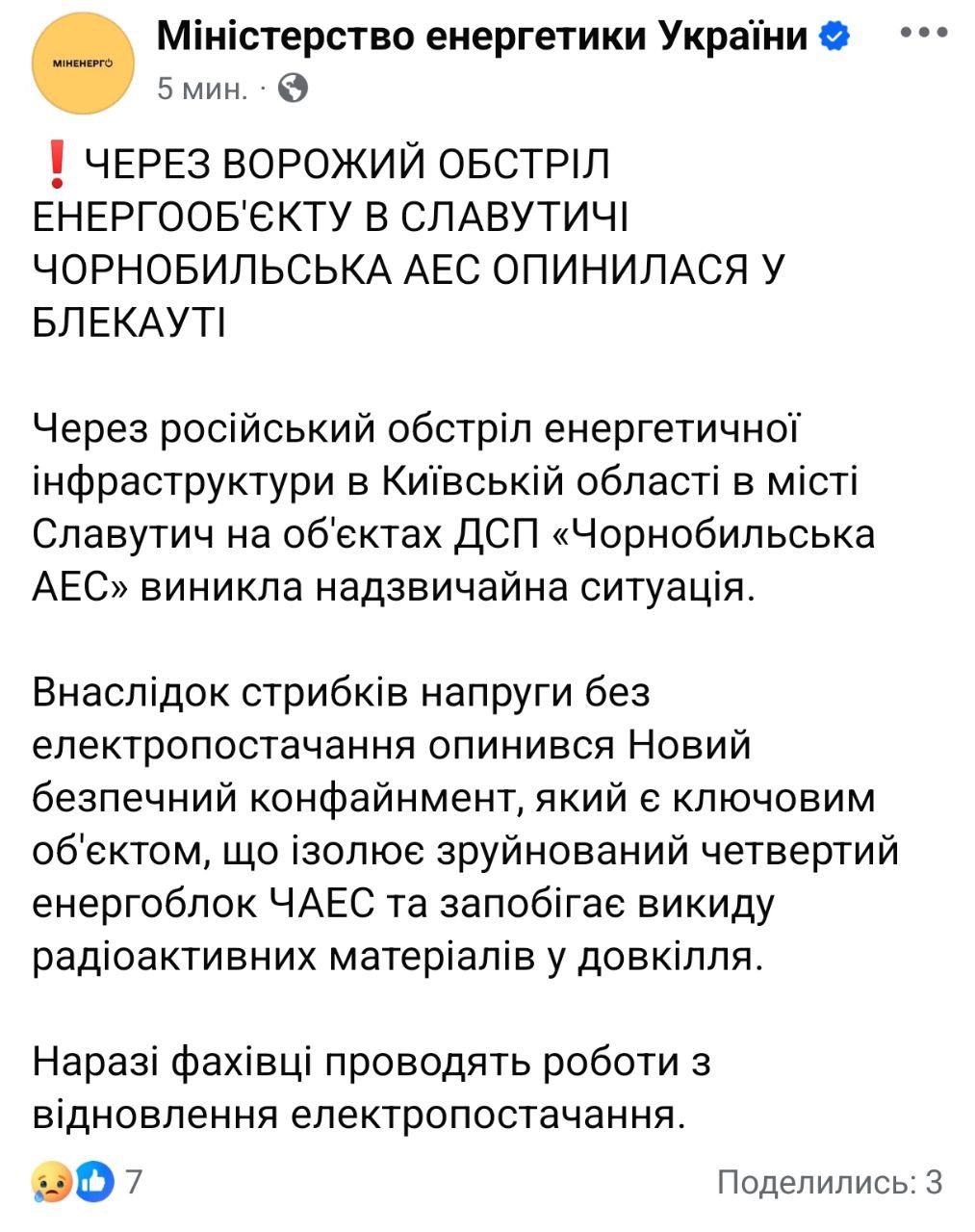 Чернобыльская АЭС оказалась в состоянии блэкаута из-за обстрела энергетического объекта в городе Славутич в Киевской области.